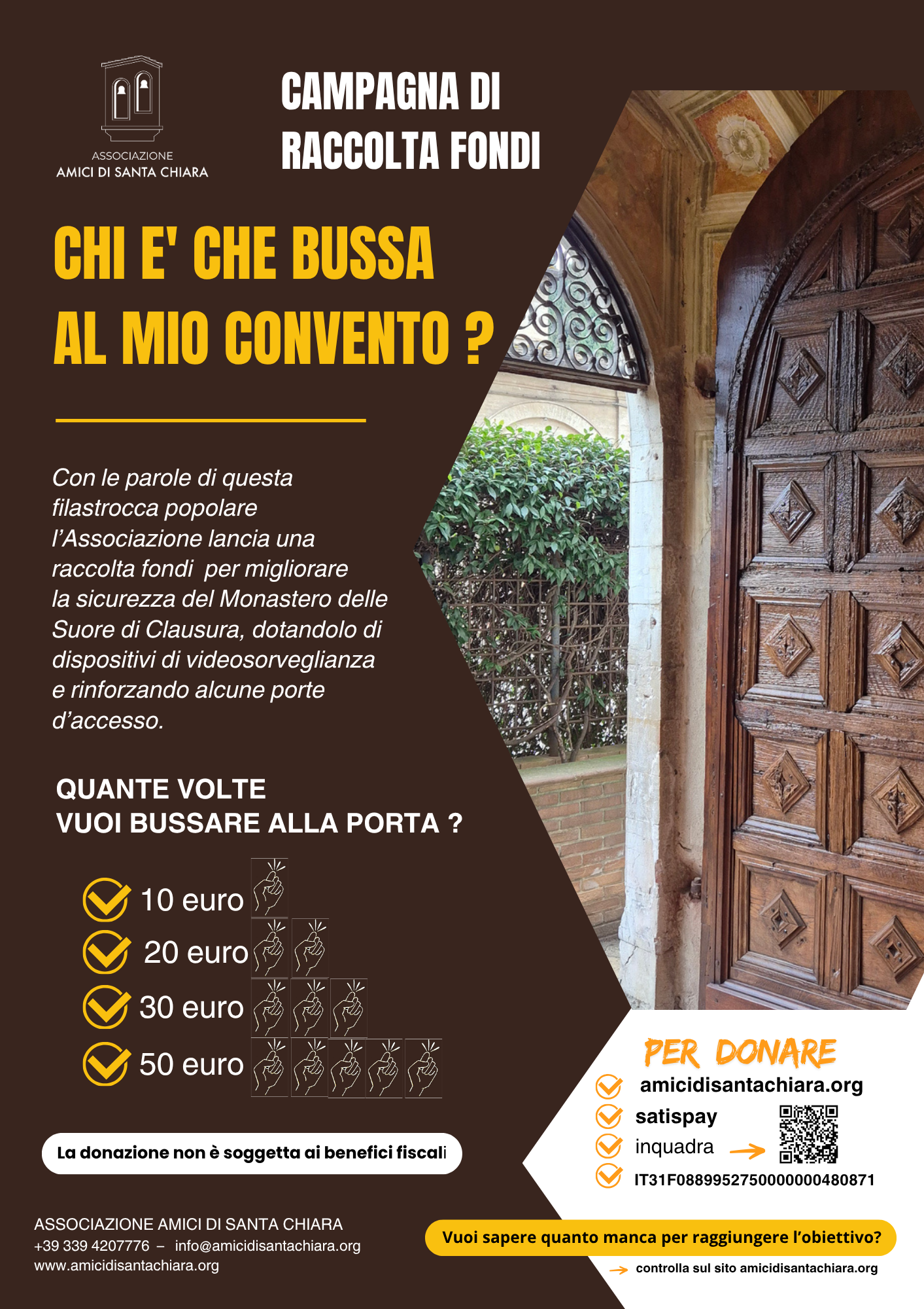 In seguito al successo della raccolta fondi di un anno fa, denominata “Fai splendere una piastrella” , che ci ha permesso di lucidare il pavimento della Chiesa del Convento, pulire tutte le parti alte della stessa Chiesa e rifare i tendaggi posti alle finestre superiori, anche quest’anno l’Assemblea degli Associati ha approvato il lancio di una nuova raccolta fondi per migliorare la sicurezza del Monastero. Il titolo dell’iniziativa prende spunto da una filastrocca popolare: “CHI E’ CHE BUSSA AL MIO CONVENTO ?” Con i proventi realizzati mediante questa nuova “raccolta fondi” verranno incaricate ditte locali per il rifacimento/restauro di alcune porte del Monastero comunicanti con l’esterno e il posizionamento di videocamere a registrazione continua all’ingresso della portineria e sul muro esterno. Le modalità di donazione sono indicate sulla locandina. Se qualcuno desidera dare un’offerta senza far conoscere il proprio nome può consegnare una busta chiusa al Monastero specificando che è in favore di questo progetto. Contiamo sempre sulla generosità di tutti quanti hanno a cuore le Suore di Clausura di Capriate e desiderano dimostrare la gratitudine per la loro presenza.