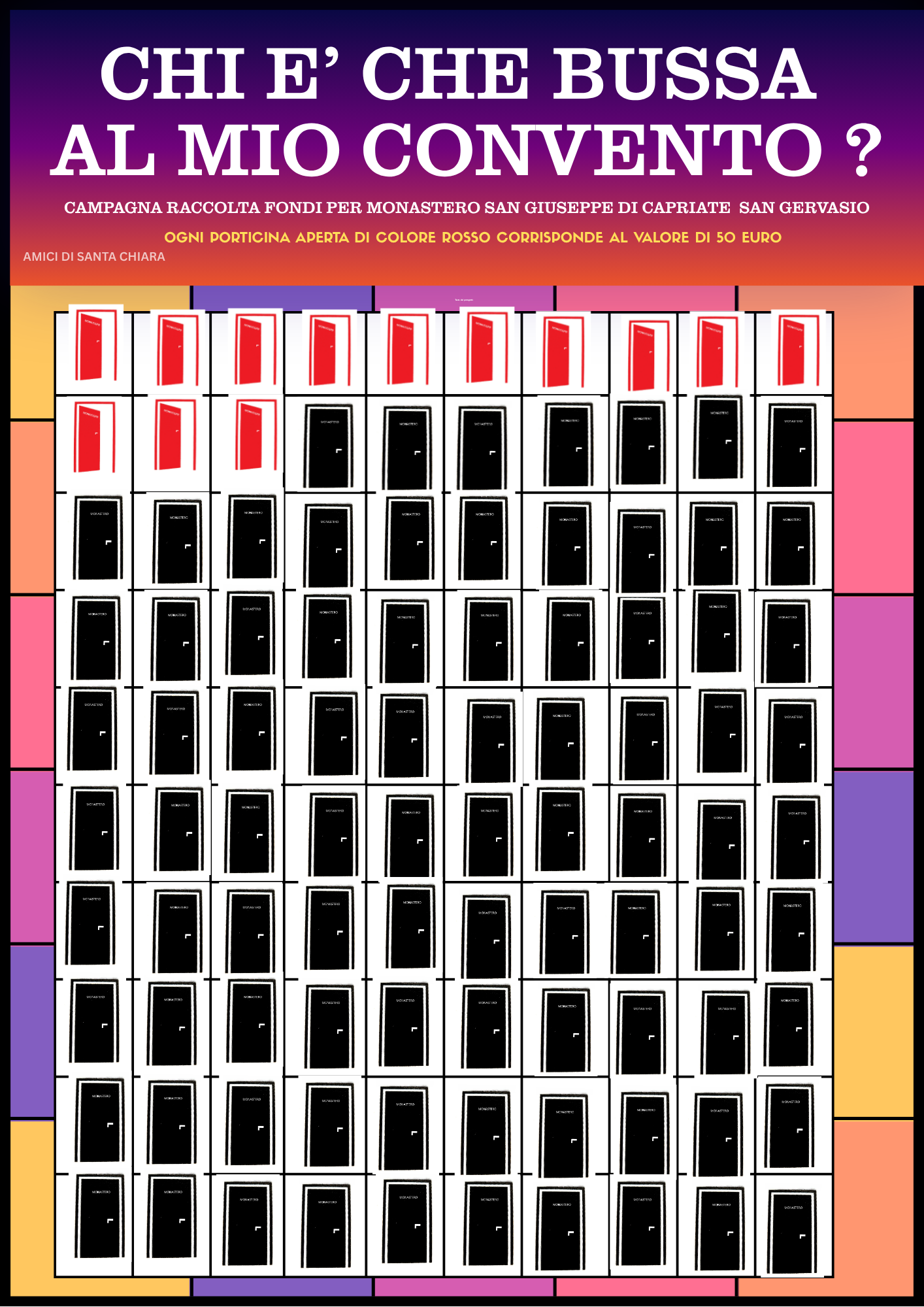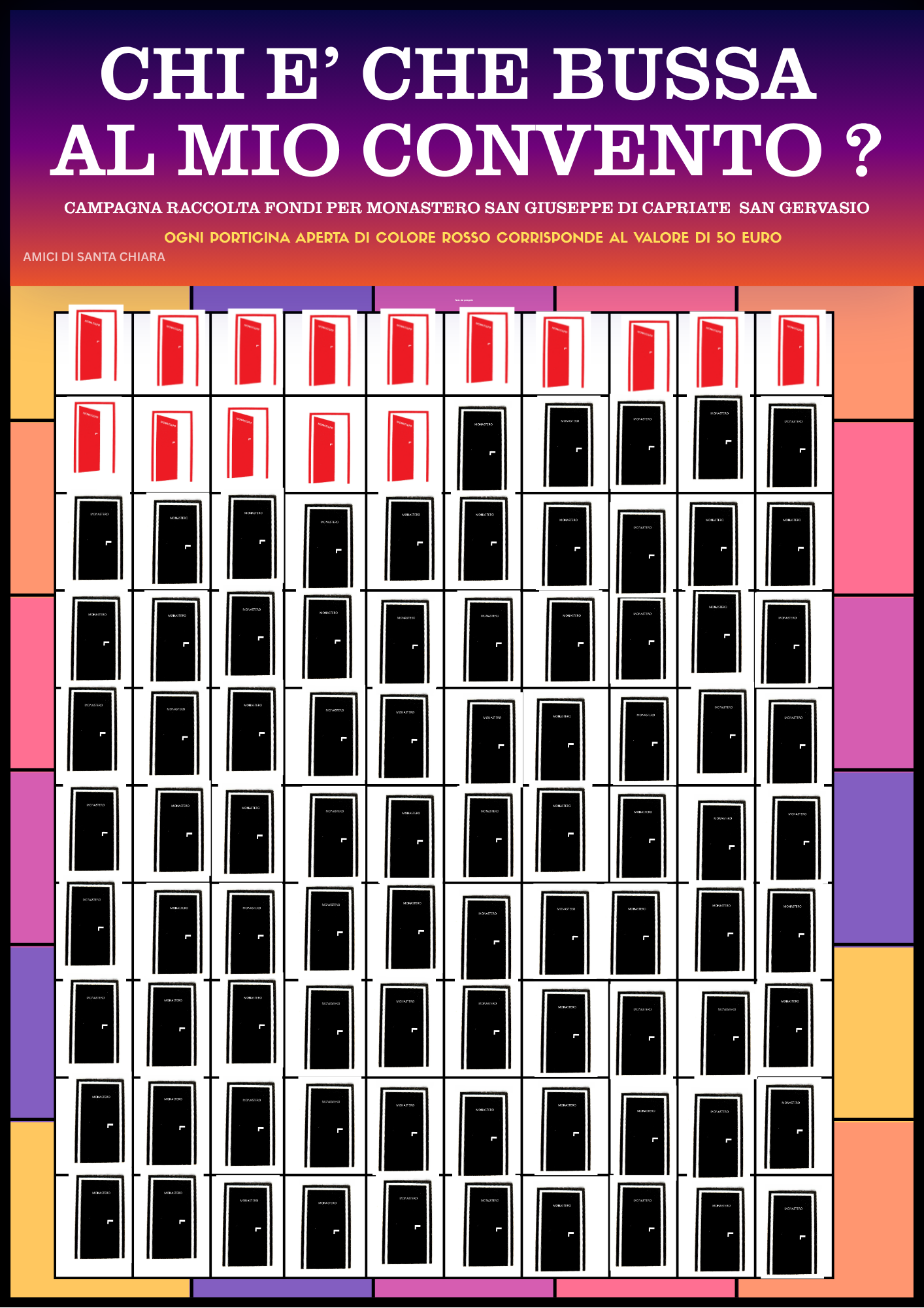 LE PORTE APERTE DI COLORE ROSSO INDICANO IL VALORE DELLE DONAZIONI EFFETTUATE PER LA CAMPAGNA DI RACCOLTA FONDI “CHI E’ CHE BUSSA AL MIO CONVENTO?”